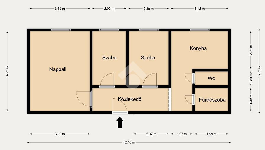Az ingatlan praktikus elosztású, szobái külön nyílnak, a konyha pedig kifejezetten nagy és tágas, így étkezőként is jól használható, családok számára is kényelmes megoldást kínál. A nyílászárók műanyagok, a burkolatok jó állapotúak, a szobákban parketta található. A délkeleti fekvésnek köszönhetően a lakás világos, napfényes.